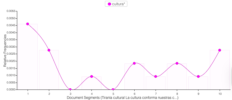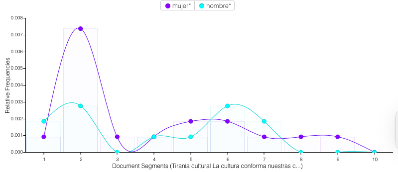 Los gráficos muestran que las palabras mujer, hombre y cultura no solo aparecen varias veces en el texto, sino que se observa una gran concentración en momentos clave del texto, lo que revela su importancia y mensaje en el capítulo.